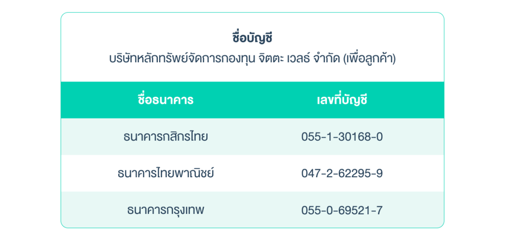 - ชื่อบัญชี บริษัทหลักทรัพย์จัดการกองทุน จิตตะ เวลธ์ จำกัด (เพื่อลูกค้า)