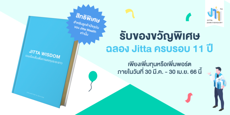 Jitta ครอบรอบ 11 ปี มองของขวัญพิเศษหนังสือ ‘Jitta Wisdom’ ให้กับนักลงทุน Jitta Wealth ที่ร่วมเดินทางกับเรามา หนังสือสุด Exclusive ที่ไม่มีขายที่ไหน เพียงเพิ่มทุนหรือเพิ่มพอร์ต ภายใน 30 มี.ค. – 30 เม.ย. 66 นี้
