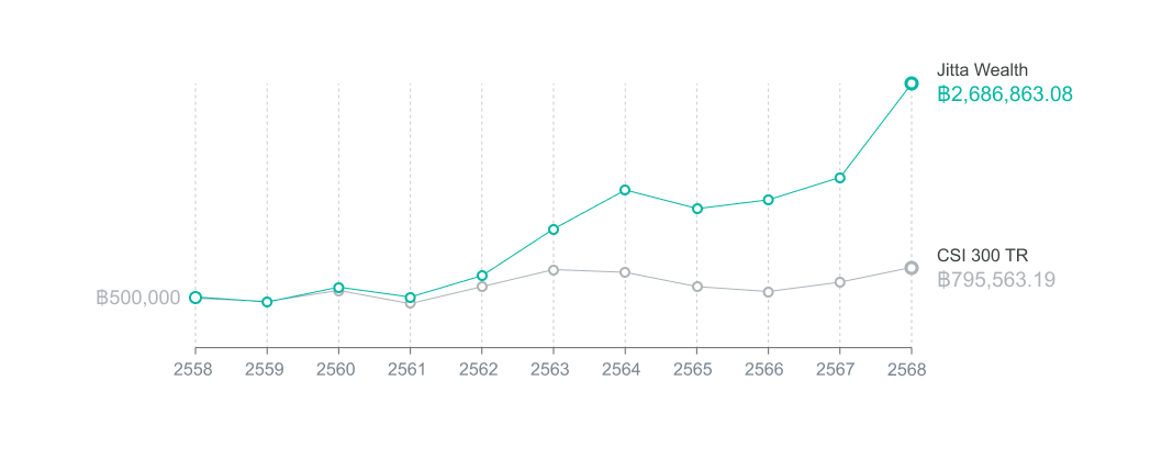 นั่นก็เพราะ Jitta Wealth เป็นการลงทุนแบบ Passive Investing ที่นำเทคโนโลยีเข้ามาช่วยสร้างผลตอบแทนที่ดีกว่า รักษาวินัยการลงทุนให้สม่ำเสมอ ในขณะเดียวกันก็มีค่าธรรมเนียมต่ำ จึงทำกำไรได้ดีกว่าอย่างยั่งยืน