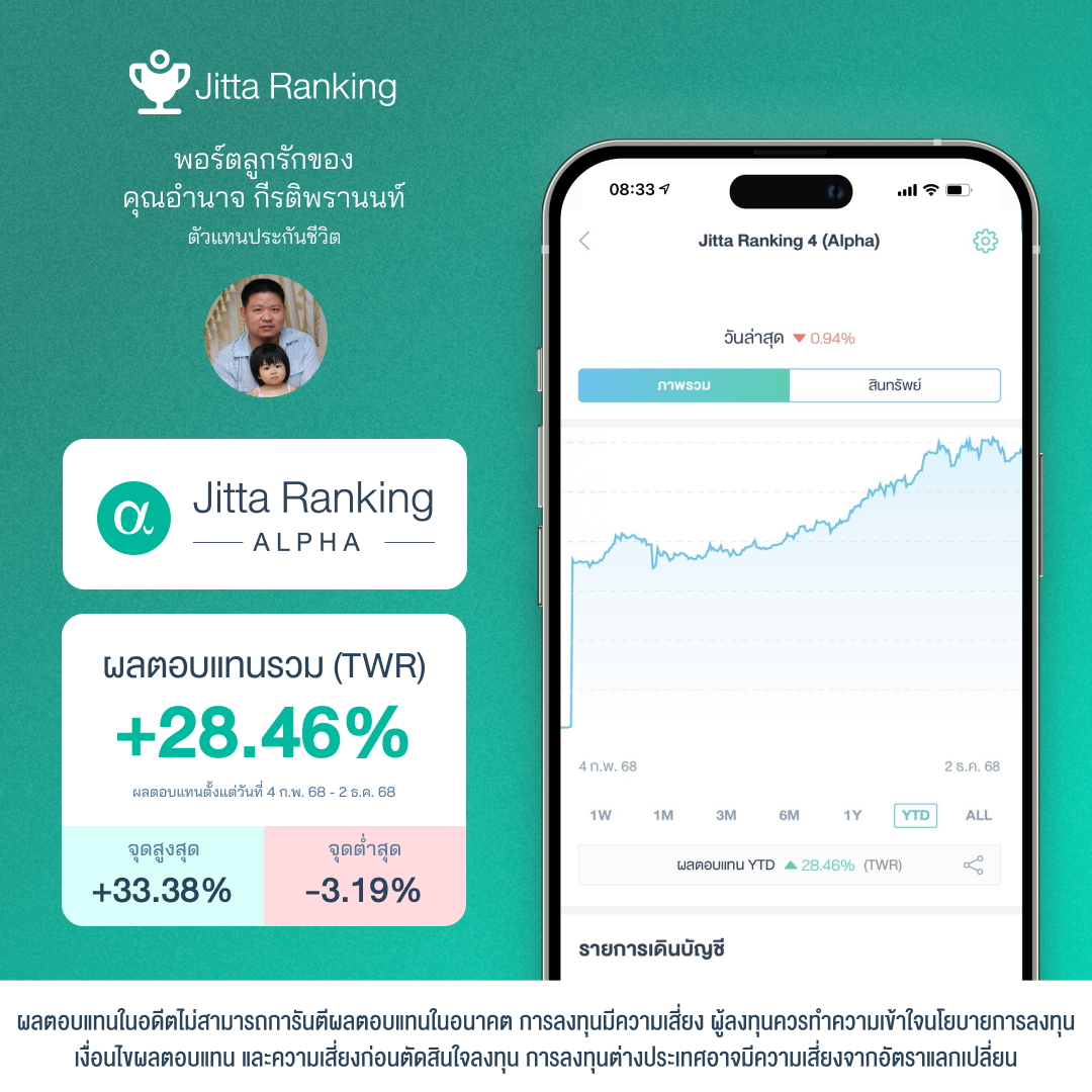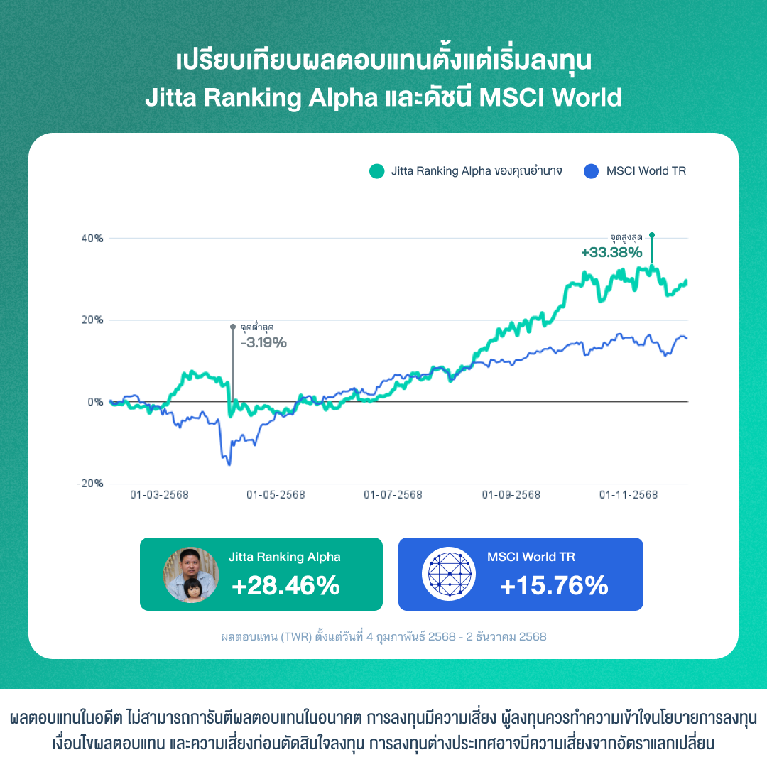 “ผลตอบแทนที่ 28% ในช่วงไม่ถึงปี ถือว่าโอเคเลย เราไม่ได้คาดหวังเยอะ แต่รู้ว่าการลงทุนไม่ใช่ว่ากราฟจะขึ้นตลอด แต่ตราบใดที่เรายัง DCA ไปเรื่อยๆ ในสินทรัพย์ที่ถูกต้อง ระยะยาว ก็น่าจะเติบโต” Jitta Ranking Alpha +28.46% (4 ก.พ.2568 – 2 ธ.ค. 2568)