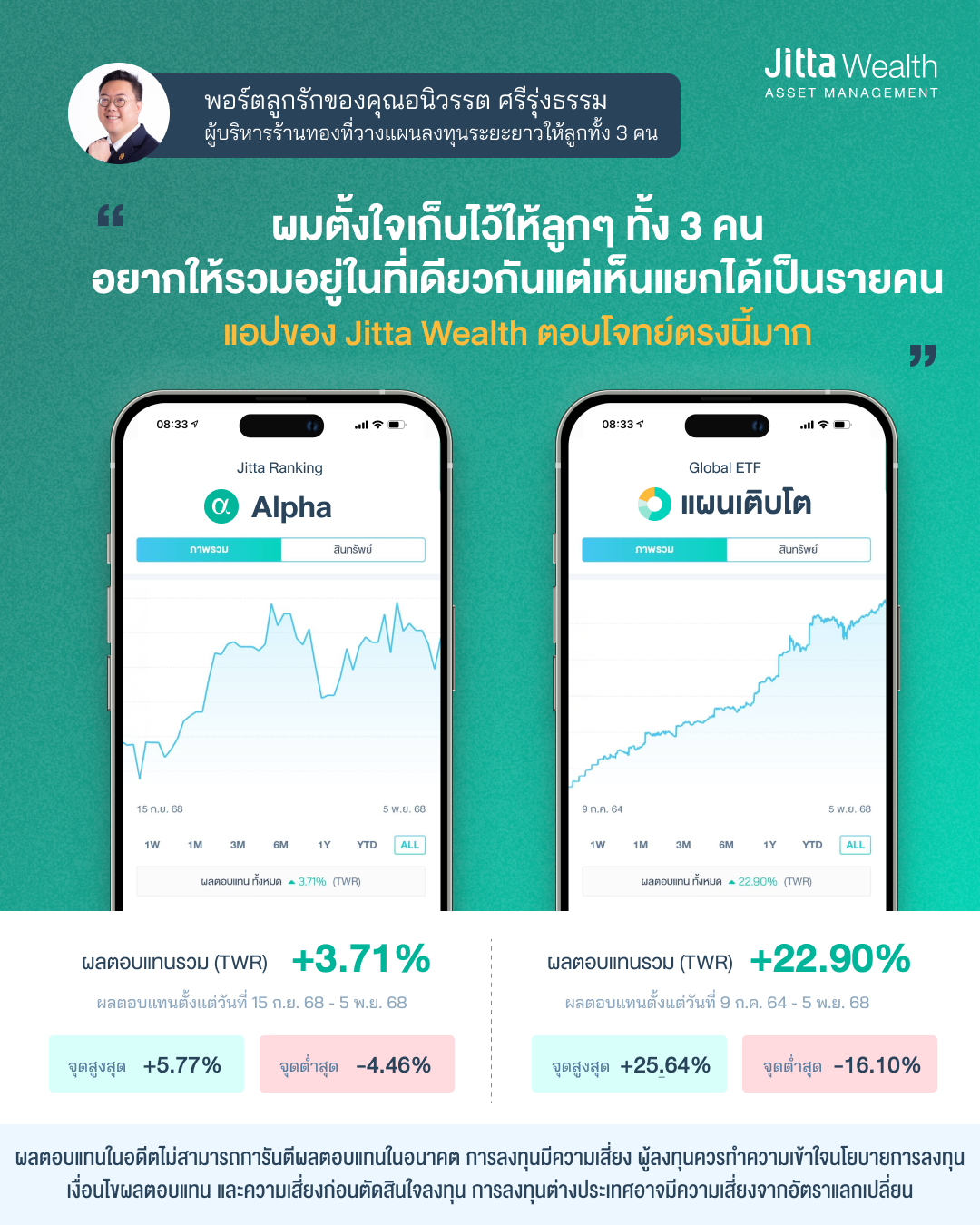 ผมตั้งใจเก็บไว้ให้ลูกๆ ทั้ง 3 คน อยากให้รวมอยู่ในที่เดียวกันแต่เห็นแยกได้เป็นรายคน แอปของ Jitta Wealth ตอบโจทย์ตรงนี้มาก