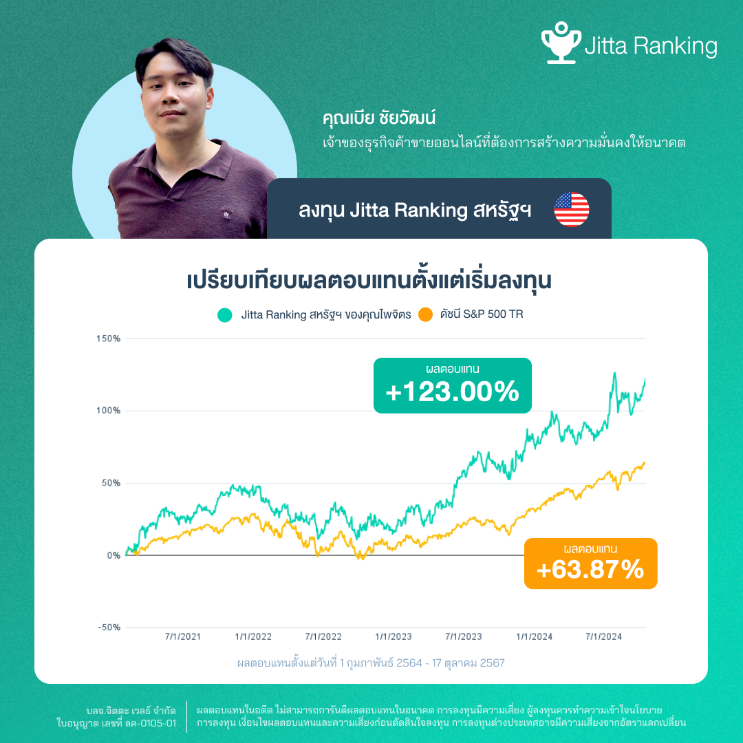 เพราะความแน่นอนคือความไม่แน่นอน การเตรียมตัวเพื่ออนาคตที่มั่นคง เป็นเรื่องที่ทุกคนทุกอาชีพต้องวางแผนการเงินของตัวเองให้ดีและเดินตามเส้นทางที่วาดไว้ เช่นเดียวกับคุณเบีย ชัยวัฒน์ เจ้าของบริษัท Loyally Active ธุรกิจค้าออนไลน์บนเว็ปไซต์ amazon.com ที่ได้เตรียมสร้างพอร์ตการลงทุนของตัวเองให้แข็งแรง เพียงพอที่จะรองรับอนาคตในวันนึงที่ธุรกิจของตัวเองอาจจะต้องเลิกรา ด้วยการลงทุนใน Jitta Ranking หุ้นสหรัฐฯ จนสร้างผลตอบแทนได้ถึง +123% (วันที่ 1 ก.พ. 2564-17 ต.ค. 2567) เอาชนะดัชนี S&P500 ในช่วงเวลาเดียวกันที่ทำได้ +63.87%