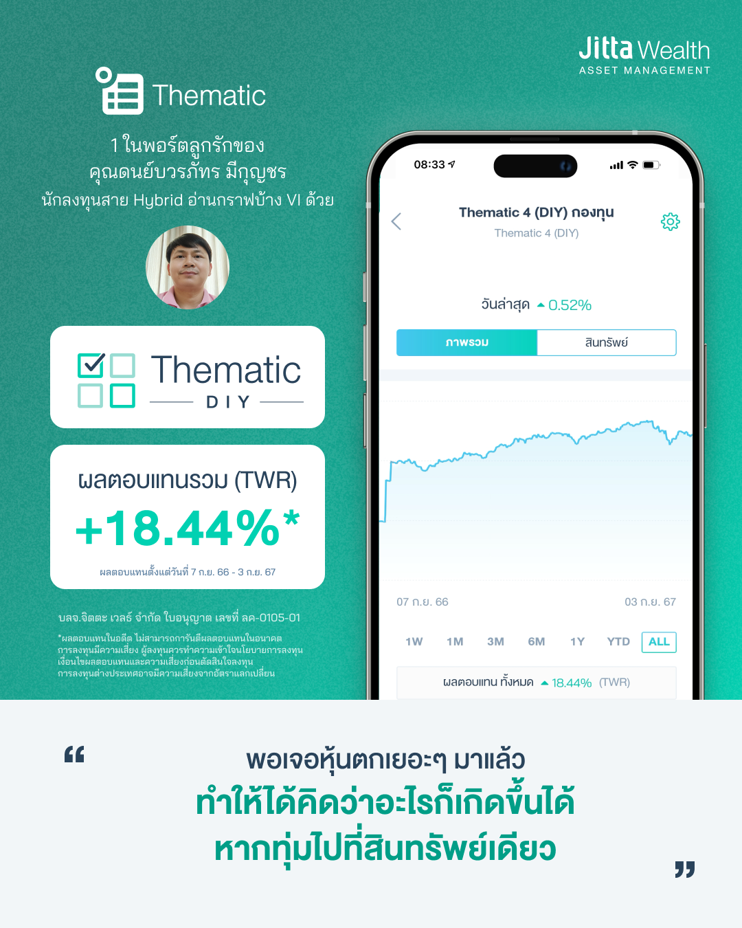 “พอเจอหุ้นตกเยอะๆ ทำให้ได้คิดว่า อะไรก็เกิดขึ้นได้ หากทุ่มไปที่สินทรัพย์เดียว” Thematic (DIY) ผลตอบแทน +18.44% (7 ก.ย. 66- 3 ก.ย. 67)