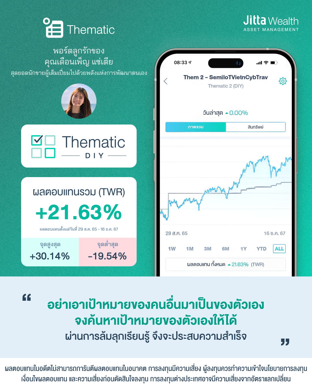 “อย่าเอาเป้าหมายของคนอื่นมาเป็นของตัวเอง จงค้นหาเป้าหมายของตัวเองให้ได้ ผ่านการล้มลุก เรียนรู้ จึงจะประสบความสำเร็จ” Thematic DIY +21.63% (29 ส.ค. 65 – 16 ธ.ค. 67)