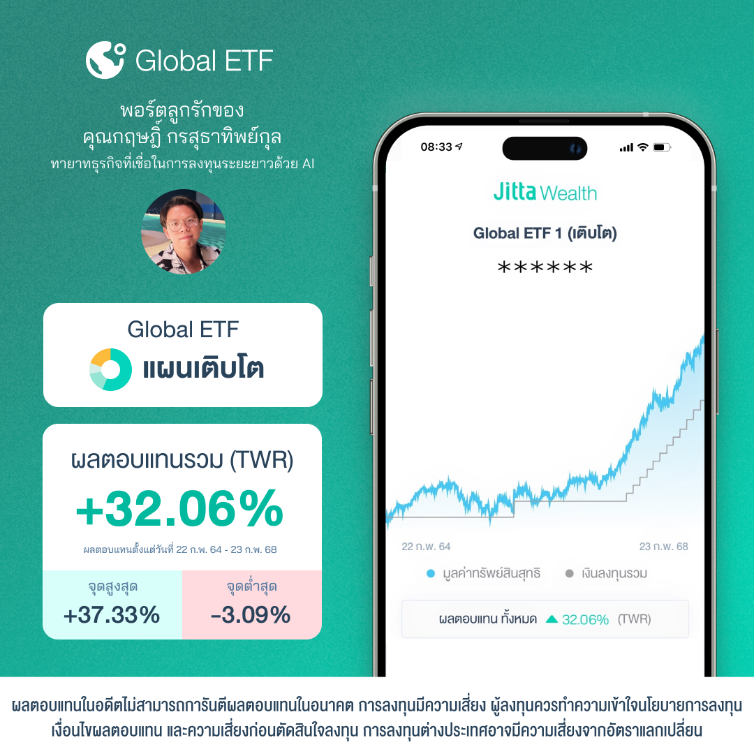 หลังจากทดลองเปิดกองทุน Robo Advisor ประมาณ 1 ปี คุณกฤษฎิ์ก็มาเปิดพอร์ตแรกกับ Jitta Wealth ด้วย Global ETF ผ่านมาถึงวันนี้ Global ETF บวกไปแล้ว 32.06% แต่กองทุน Robo Advisor ที่เปิดไว้ก่อนหน้านั้นผลตอบแทนที่ได้ยังแพ้ดอกเบี้ยเงินฝากทั้งที่เป็นพอร์ตเสี่ยงสูง และ DCA ต่อเนื่อง 1,000 บาทต่อเดือน แต่เขาไม่ได้รู้สึกผิดหวังกับ AI เพราะหลักการลงทุนของเขาคือเน้นระยะยาวมากกว่า