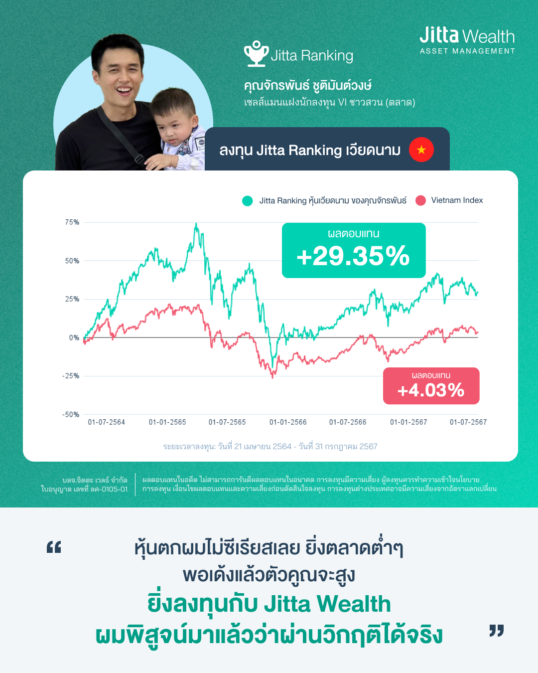 เมื่อเห็นภาพผลลัพธ์ที่ชัดเจนนี้แล้วว่า Jitta Wealth พาพอร์ตผ่านวิกฤติได้แน่นอน แถมผลงานดีกว่าที่เขาลงทุนเอง เมื่อหุ้นเด้งกลับมา เขาจึงตัดสินใจโยกเงินทั้งหมดมาไว้ที่ Jitta Wealth และขายพอร์ต Jitta Ranking หุ้นไทย เพื่อรวมเป็นเงินก้อนใหญ่ไปเปิด Jitta Ranking หุ้นเวียดนาม เนื่องจากในขณะนั้นตลาดเวียดนามกำลังเนื้อหอม แม้เวลานั้นหุ้นไทยฟื้นจากโควิดมาจนมีกำไรแล้ว แต่เมื่อมองไปข้างหน้า เขาเชื่อว่าตลาดหุ้นเวียดนามไปไกลกว่า ประกอบกับการศึกษาข้อมูลแล้วพบว่าหลักการของ Quant VI จะใช้ได้ดีในตลาดเกิดใหม่ เขาจึงเทไปที่พอร์ต Jitta Ranking หุ้นเวียดนามหมดเลย