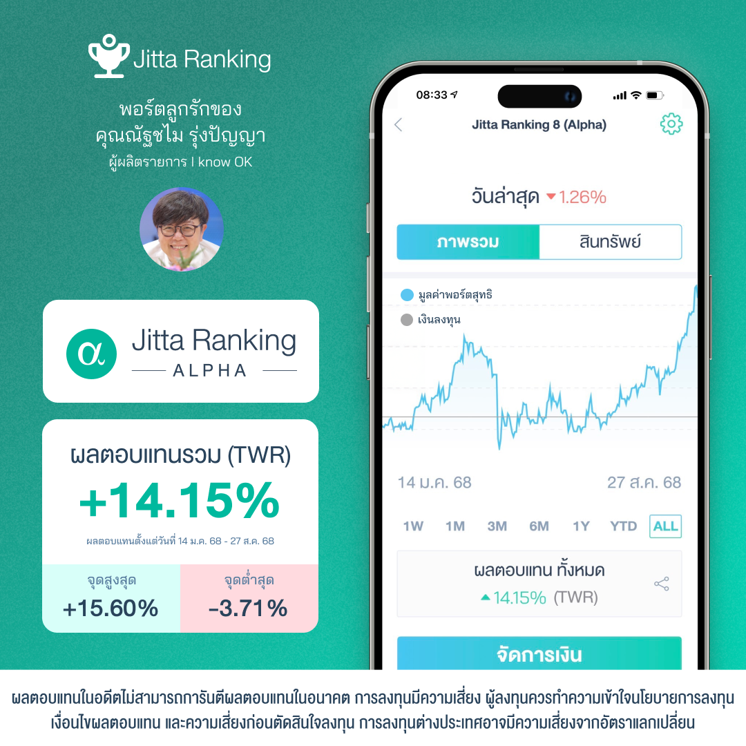 “ จากที่จะใช้เวลา 9 ปีเก็บเงินเกษียณ กลับใช้เวลาเพียง 6 ปีกว่า เงินเติบโตถึงเป้า สบายใจ เกษียณได้ไม่เครียดแล้ว” Jitta Ranking Alpha +14.15% (14 ม.ค.68-27ส.ค.68)