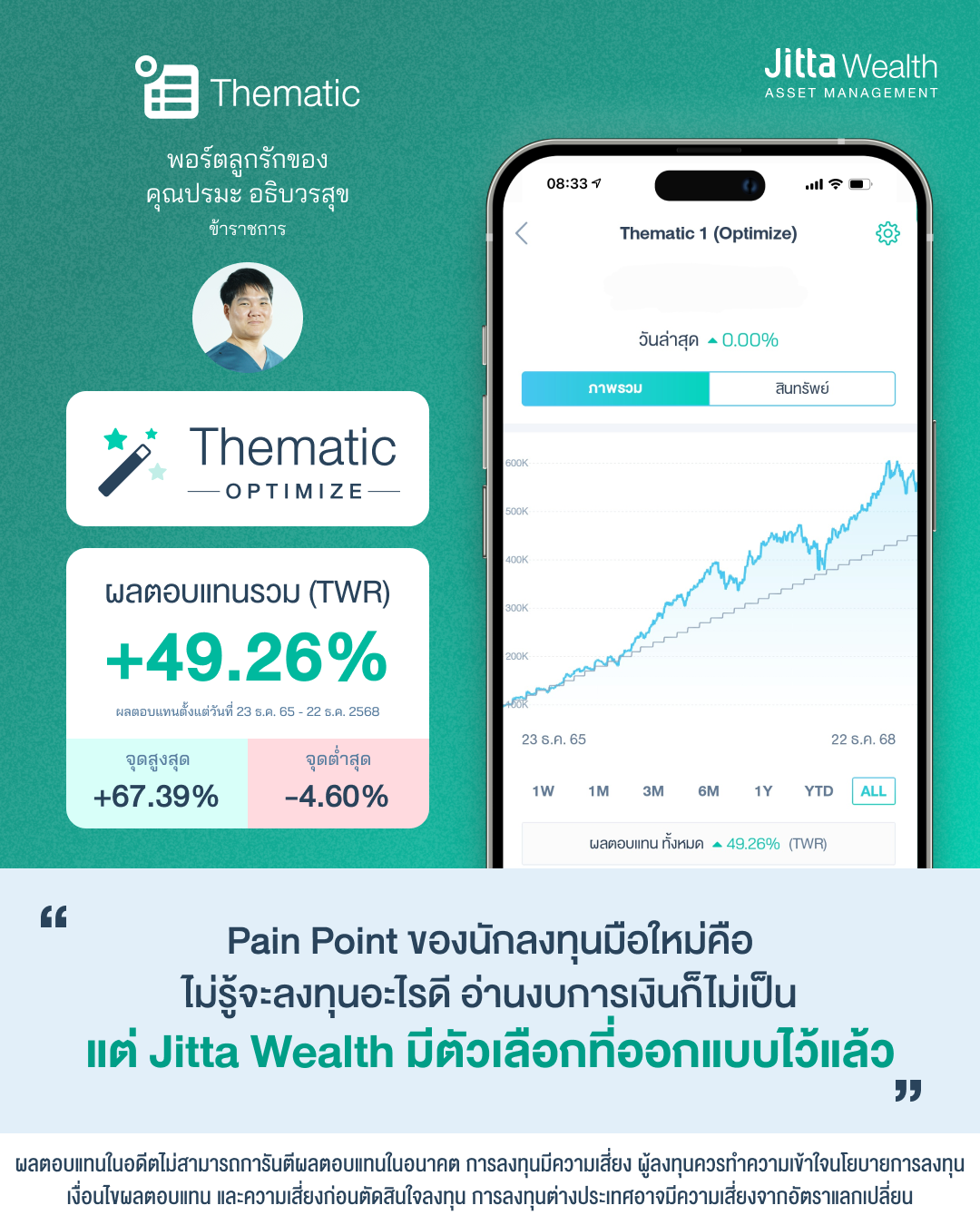 “Pain Point ของนักลงทุนมือใหม่คือ ไม่รู้จะลงทุนอะไรดี อ่านงบการเงินก็ไม่เป็น แต่ Jitta Wealth มีตัวเลือกที่ออกแบบไว้แล้ว” Thematic Optimize +49.26% (23 ธ.ค. 65 – 22 ธ.ค. 2568)