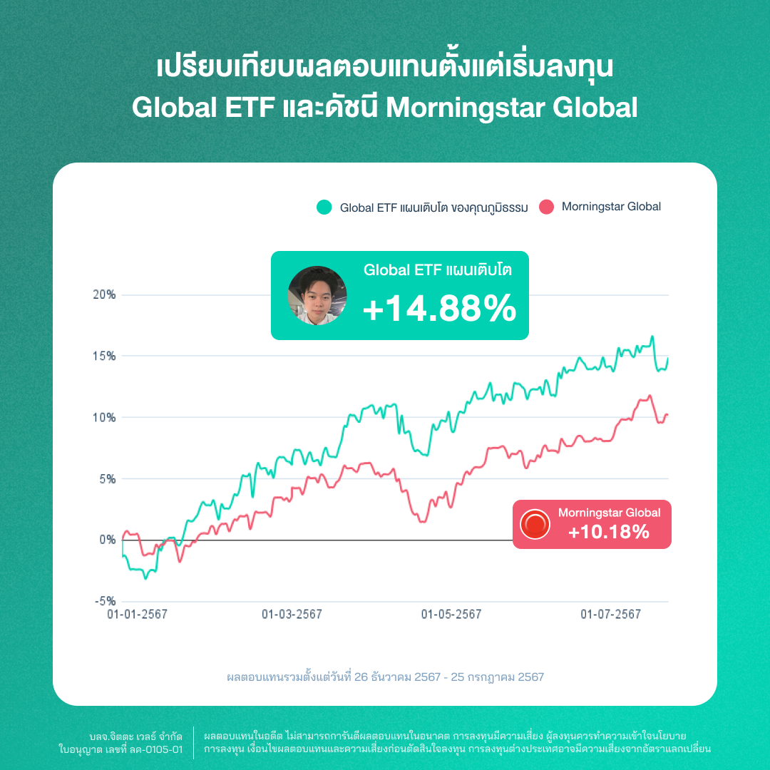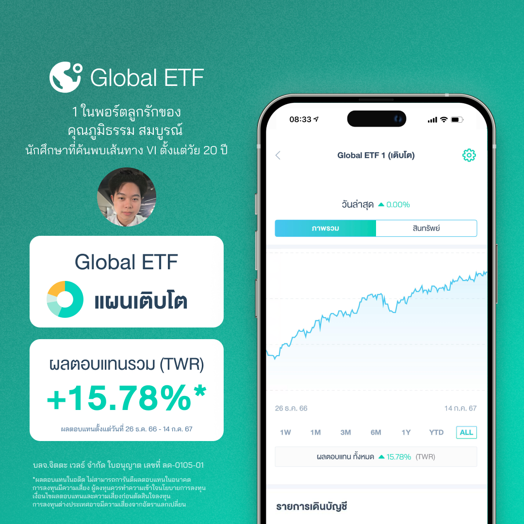หากพูดถึงอายุกับความเสี่ยงในการลงทุน แน่นอนว่าอายุน้อยสามารถรับความเสี่ยงได้มาก แต่นั่นก็ไม่ได้หมายความว่าจะต้องลงทุนแบบเสี่ยงๆ ตั้งแต่เริ่มต้นลงทุน เช่นเดียวกับคุณภูมิธรรม สมบูรณ์ นักศึกษาวัย 20 ปี ที่สนใจเรื่องการลงทุน และศึกษาจนมั่นใจในแนวทางการสร้างผลตอบแทนทบต้น เลือกเดินบนถนนสาย VI อย่างจริงจัง กับพอร์ต Global ETF ผลตอบแทน +15.78%