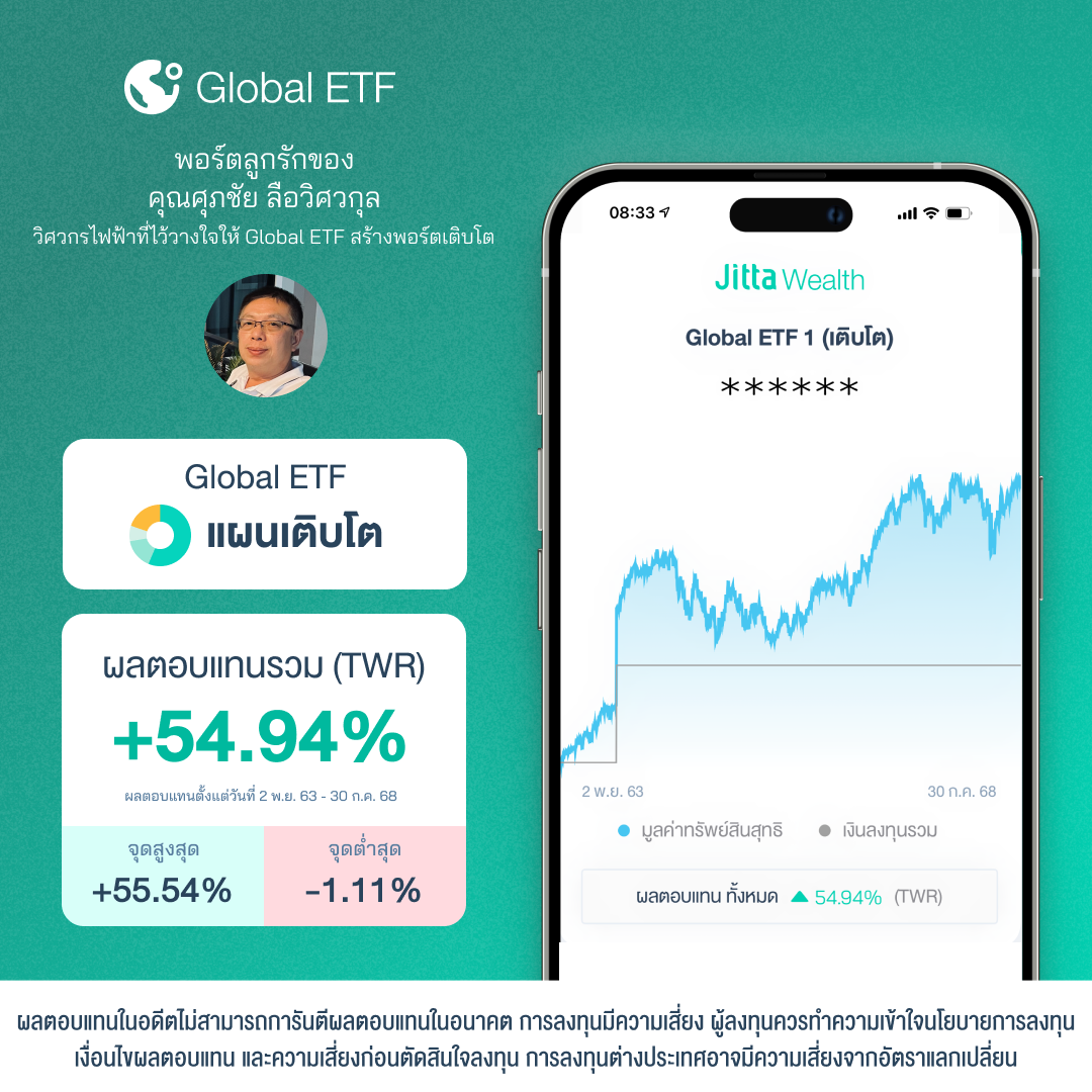 การใช้เวลากับการลงทุนด้วยตัวเองพร้อมๆ กับการทำหน้าที่ในบทบาทต่างๆ ของเราอาจจะไม่ใช่เรื่องง่าย โดยเฉพาะหากต้องการผลลัพธ์ที่ดี และนั่นก็ทำให้คุณศุภชัย ลือวิศวกุล วิศวกรไฟฟ้าจากบริษัท ZI-ARGUS.,LTD. ชึ่งทำงานเกี่ยวกับระบบไฟฟ้าออโตเมชั่น เลือกที่จะให้ Jitta Wealth เข้ามาช่วยบริหารพอร์ตการลงทุนให้งอกเงย ด้วยพอร์ต Global ETF ชึ่งที่ผ่านมาได้ผลตอบแทน +54.94%(2 พ.ย.63- 30 ก.ค.68)