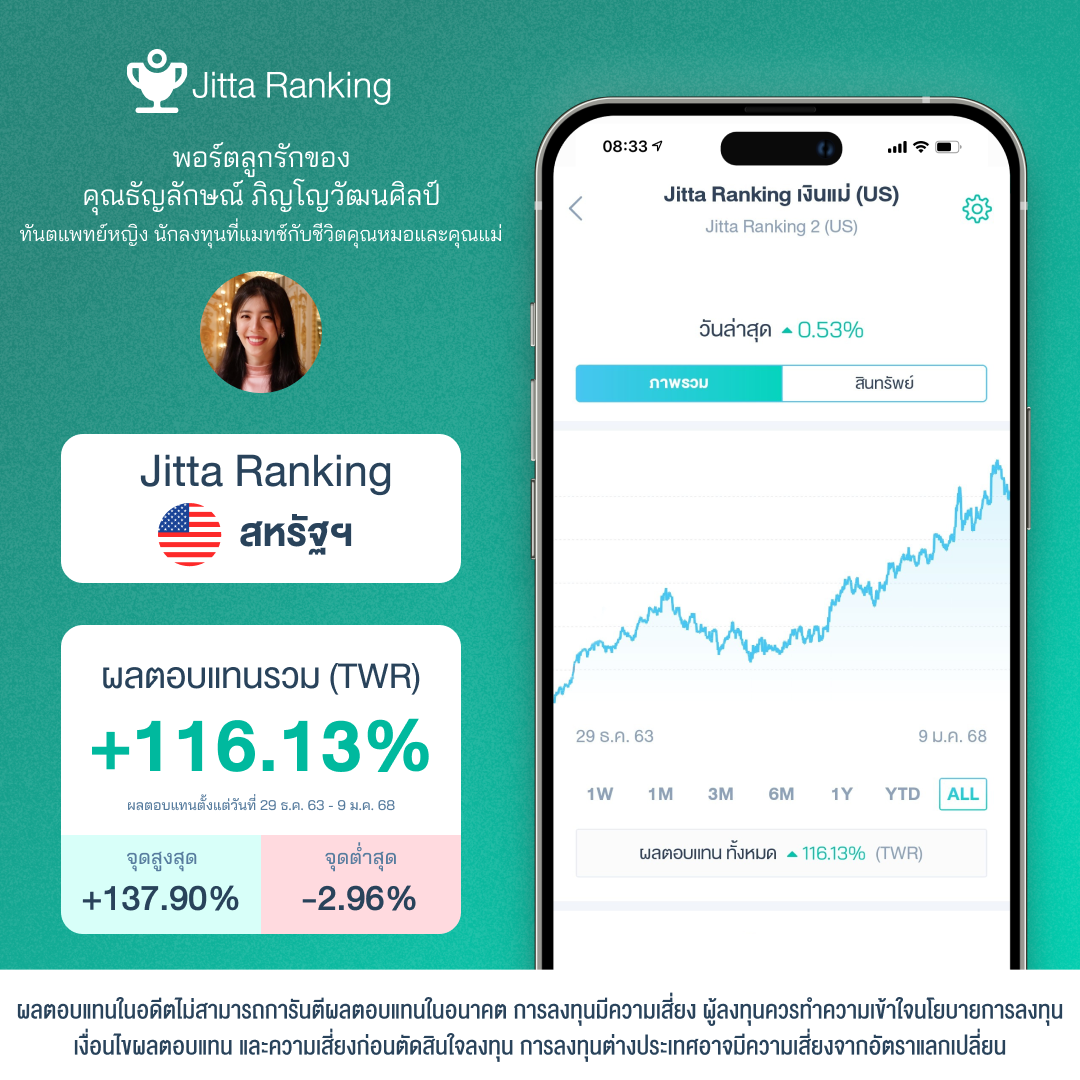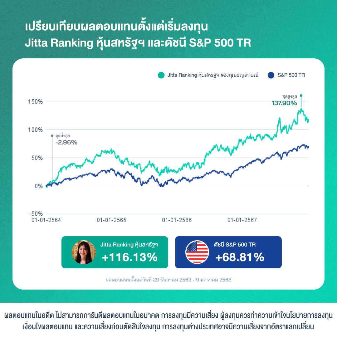“ถ้าลงทุนเองต้องคอยอัปเดตและปรับพอร์ต สุดท้ายก็เครียด แต่การลงทุนกับ Jitta Wealth แมทช์กับชีวิตมากกว่า ไม่ต้องปวดหัว หรือกังวลใดๆ” Jitta Ranking หุ้นสหรัฐฯ +116.13% (29 ธ.ค. 2563- 9 ม.ค. 2568)