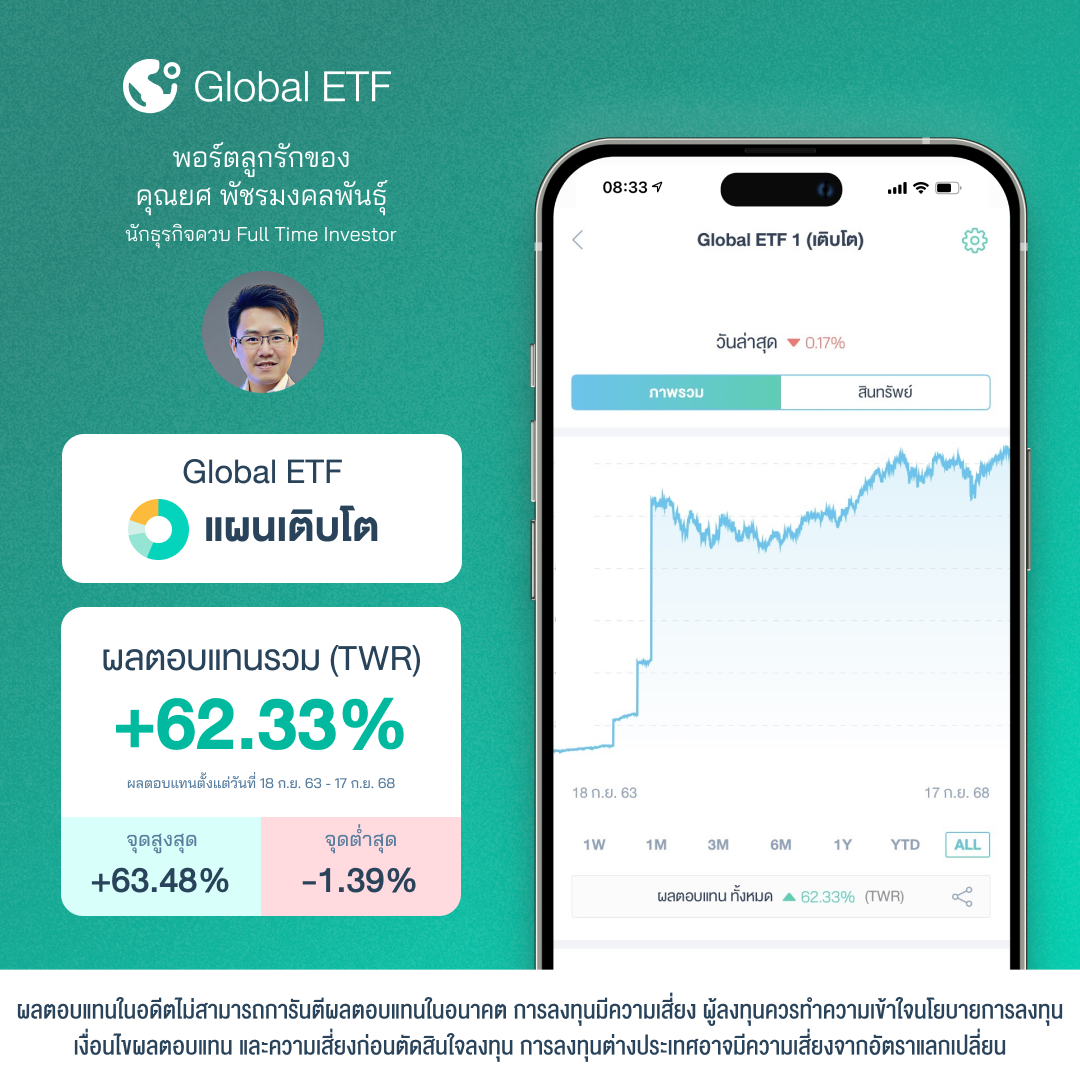 “การลงทุนยิ่งเริ่มเร็วยิ่งได้เปรียบ” วลีนี้ไม่เกินจริง หากใครตระหนักรู้และได้ทดลองด้วยตัวเองก็จะพบความสำเร็จในโลกการเงินได้ เช่นเดียวกับคุณยศ พัชรมงคลพันธุ์ นักธุรกิจควบ Full Time Investor ที่เริ่มลงทุนตั้งแต่ยังเรียนไม่จบ จนทุกวันนี้ พอร์ตของเขาเติบโตไปพร้อมกับเป้าหมายชีวิตที่กำหนดได้เอง สร้างความสุขจากการได้ทำในสิ่งที่รักนั่นก็คือการลงทุนและการดูแลครอบครัวไปพร้อมกับการเรียนรู้โลกลงทุนที่ไม่รู้จบไปกับพอร์ต Global ETF +62.33% (18 ก.ย. 2563 – 17 ก.ย. 2568)